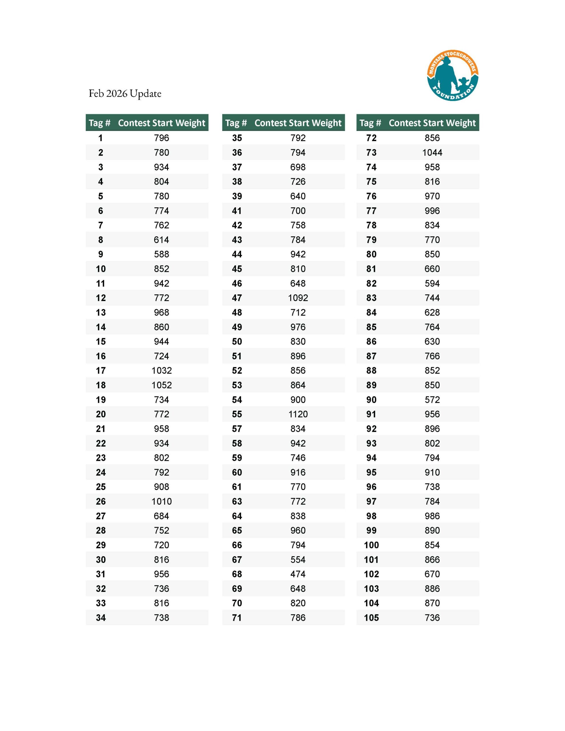 Thanks to your generous support, we have 102 animals in this year’s program. The contest began February 4, 2026, at Yellowstone Cattle Feeders in Shepherd, where starting weights and TSUs were recorded to kick off the competition.